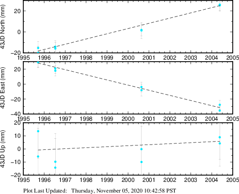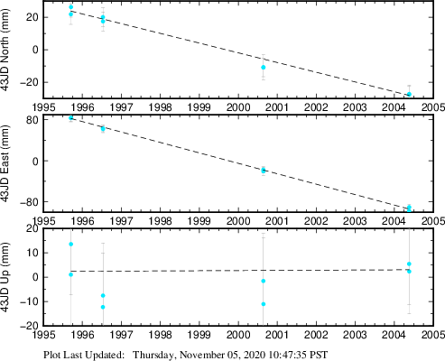 These results are preliminary. The station positions are unchecked and should not be used for any engineering applications. There may be errors in the antenna heights. The velocities are very dependent on the length of the span of observations. The presence of outliers (errant observations) sometimes contaminates the velocities.