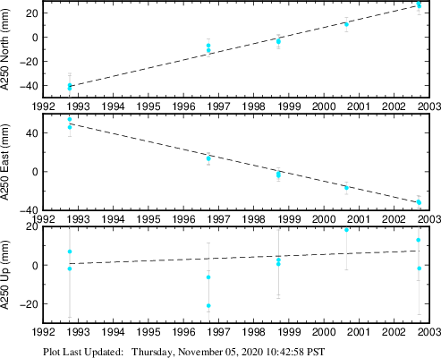 These results are preliminary. The station positions are unchecked and should not be used for any engineering applications. There may be errors in the antenna heights. The velocities are very dependent on the length of the span of observations. The presence of outliers (errant observations) sometimes contaminates the velocities.