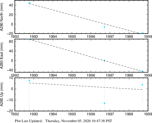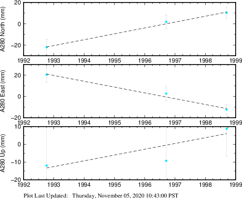 These results are preliminary. The station positions are unchecked and should not be used for any engineering applications. There may be errors in the antenna heights. The velocities are very dependent on the length of the span of observations. The presence of outliers (errant observations) sometimes contaminates the velocities.