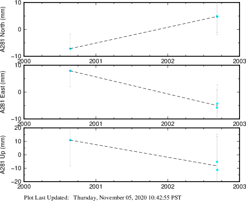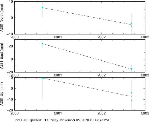 These results are preliminary. The station positions are unchecked and should not be used for any engineering applications. There may be errors in the antenna heights. The velocities are very dependent on the length of the span of observations. The presence of outliers (errant observations) sometimes contaminates the velocities.