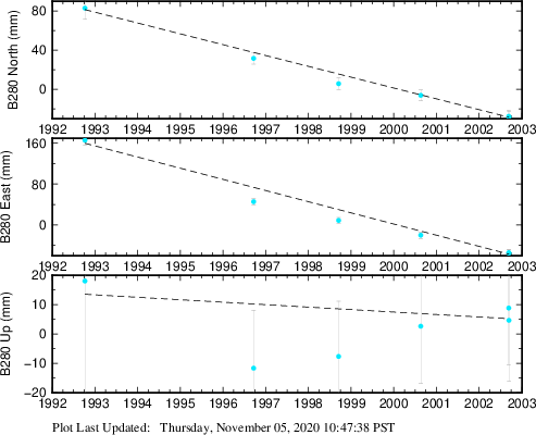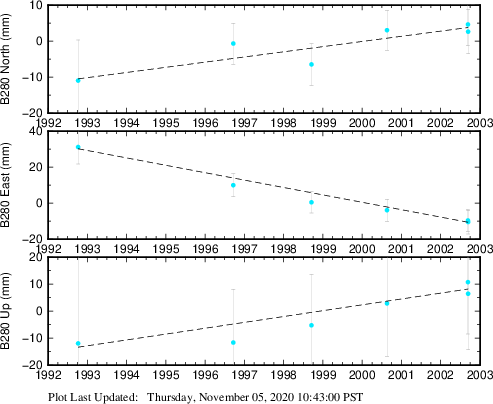 These results are preliminary. The station positions are unchecked and should not be used for any engineering applications. There may be errors in the antenna heights. The velocities are very dependent on the length of the span of observations. The presence of outliers (errant observations) sometimes contaminates the velocities.