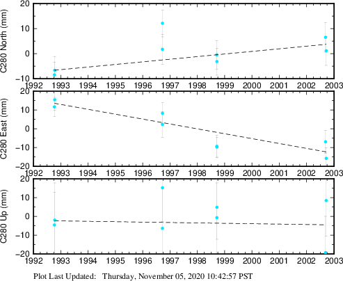 These results are preliminary. The station positions are unchecked and should not be used for any engineering applications. There may be errors in the antenna heights. The velocities are very dependent on the length of the span of observations. The presence of outliers (errant observations) sometimes contaminates the velocities.