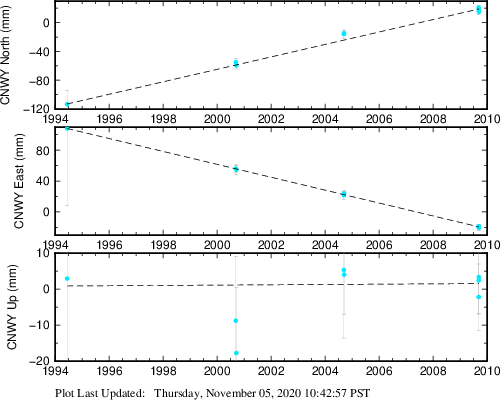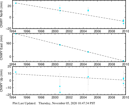 These results are preliminary. The station positions are unchecked and should not be used for any engineering applications. There may be errors in the antenna heights. The velocities are very dependent on the length of the span of observations. The presence of outliers (errant observations) sometimes contaminates the velocities.