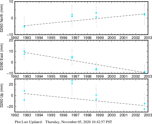 These results are preliminary. The station positions are unchecked and should not be used for any engineering applications. There may be errors in the antenna heights. The velocities are very dependent on the length of the span of observations. The presence of outliers (errant observations) sometimes contaminates the velocities.