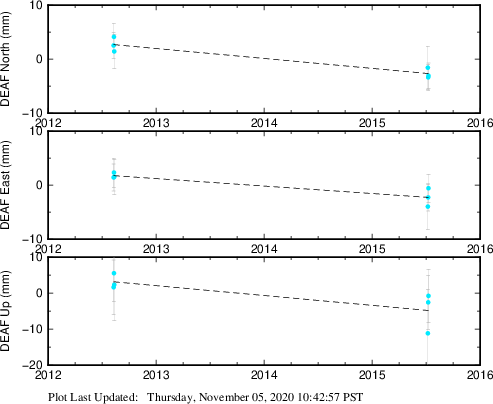 These results are preliminary. The station positions are unchecked and should not be used for any engineering applications. There may be errors in the antenna heights. The velocities are very dependent on the length of the span of observations. The presence of outliers (errant observations) sometimes contaminates the velocities.