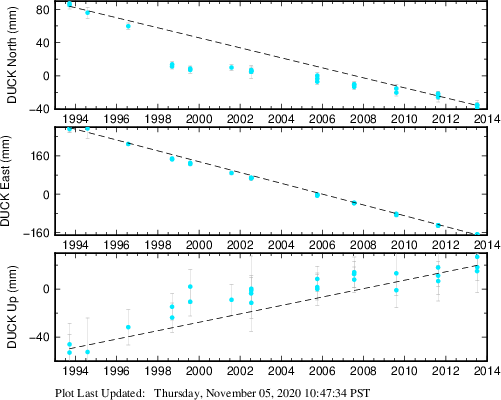 These results are preliminary. The station positions are unchecked and should not be used for any engineering applications. There may be errors in the antenna heights. The velocities are very dependent on the length of the span of observations. The presence of outliers (errant observations) sometimes contaminates the velocities.