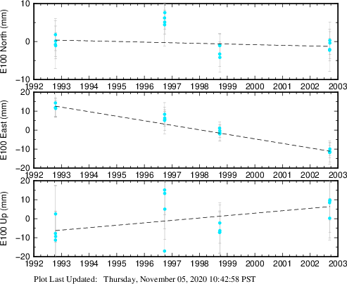 These results are preliminary. The station positions are unchecked and should not be used for any engineering applications. There may be errors in the antenna heights. The velocities are very dependent on the length of the span of observations. The presence of outliers (errant observations) sometimes contaminates the velocities.