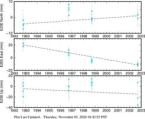 These results are preliminary. The station positions are unchecked and should not be used for any engineering applications. There may be errors in the antenna heights. The velocities are very dependent on the length of the span of observations. The presence of outliers (errant observations) sometimes contaminates the velocities.