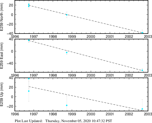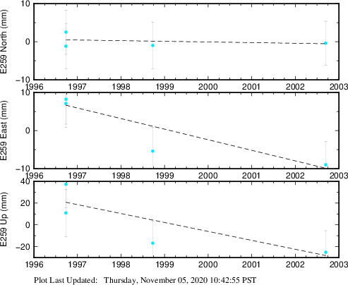 These results are preliminary. The station positions are unchecked and should not be used for any engineering applications. There may be errors in the antenna heights. The velocities are very dependent on the length of the span of observations. The presence of outliers (errant observations) sometimes contaminates the velocities.