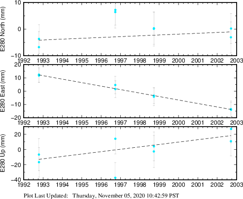 These results are preliminary. The station positions are unchecked and should not be used for any engineering applications. There may be errors in the antenna heights. The velocities are very dependent on the length of the span of observations. The presence of outliers (errant observations) sometimes contaminates the velocities.