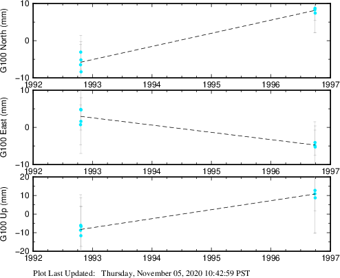 These results are preliminary. The station positions are unchecked and should not be used for any engineering applications. There may be errors in the antenna heights. The velocities are very dependent on the length of the span of observations. The presence of outliers (errant observations) sometimes contaminates the velocities.