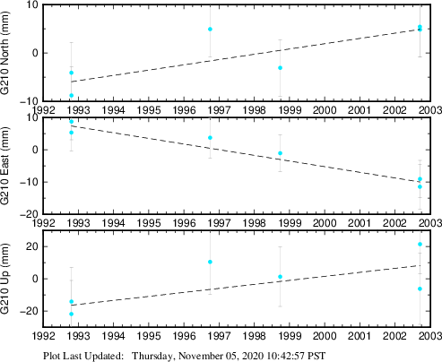 These results are preliminary. The station positions are unchecked and should not be used for any engineering applications. There may be errors in the antenna heights. The velocities are very dependent on the length of the span of observations. The presence of outliers (errant observations) sometimes contaminates the velocities.
