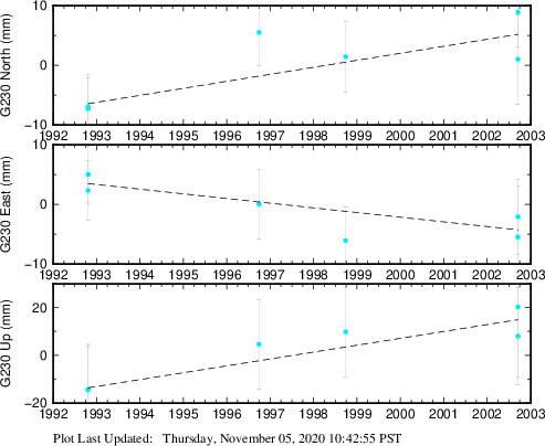 These results are preliminary. The station positions are unchecked and should not be used for any engineering applications. There may be errors in the antenna heights. The velocities are very dependent on the length of the span of observations. The presence of outliers (errant observations) sometimes contaminates the velocities.