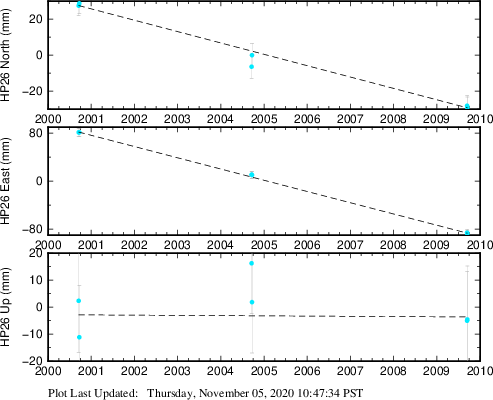 These results are preliminary. The station positions are unchecked and should not be used for any engineering applications. There may be errors in the antenna heights. The velocities are very dependent on the length of the span of observations. The presence of outliers (errant observations) sometimes contaminates the velocities.