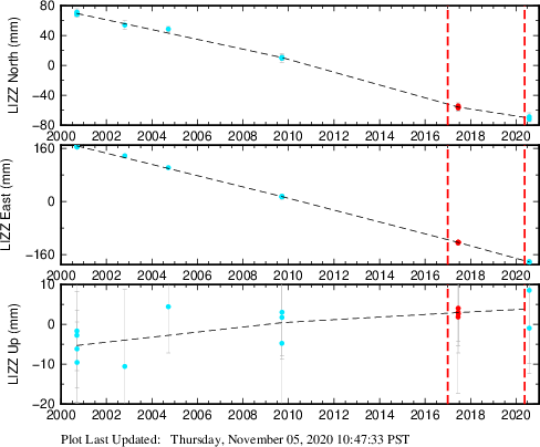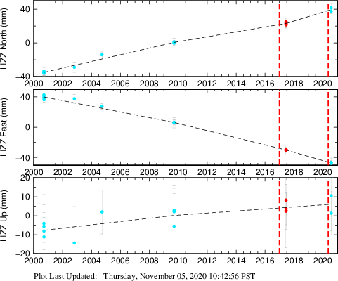 These results are preliminary. The station positions are unchecked and should not be used for any engineering applications. There may be errors in the antenna heights. The velocities are very dependent on the length of the span of observations. The presence of outliers (errant observations) sometimes contaminates the velocities.