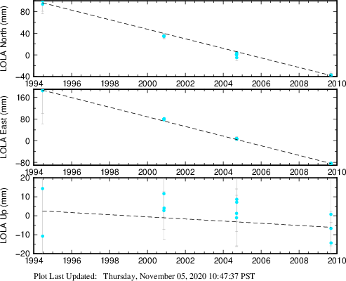 These results are preliminary. The station positions are unchecked and should not be used for any engineering applications. There may be errors in the antenna heights. The velocities are very dependent on the length of the span of observations. The presence of outliers (errant observations) sometimes contaminates the velocities.