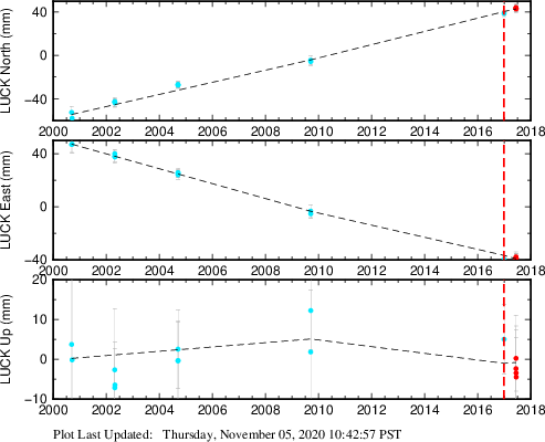 | Decimal date | N offset (mm) | N uncertainty (mm) | E offset (mm) | E uncertainty (mm) | U offset (mm) | U uncertainty (mm) | Type | Earthquake magnitude | Earthquake information | Distance from epicenter (km) | |