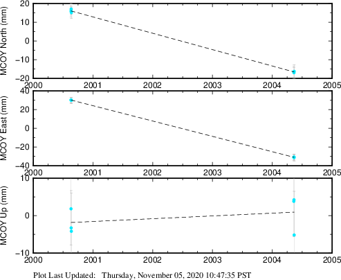 These results are preliminary. The station positions are unchecked and should not be used for any engineering applications. There may be errors in the antenna heights. The velocities are very dependent on the length of the span of observations. The presence of outliers (errant observations) sometimes contaminates the velocities.