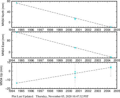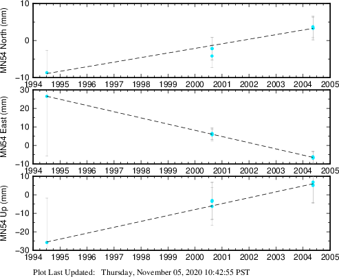 These results are preliminary. The station positions are unchecked and should not be used for any engineering applications. There may be errors in the antenna heights. The velocities are very dependent on the length of the span of observations. The presence of outliers (errant observations) sometimes contaminates the velocities.