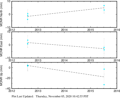 These results are preliminary. The station positions are unchecked and should not be used for any engineering applications. There may be errors in the antenna heights. The velocities are very dependent on the length of the span of observations. The presence of outliers (errant observations) sometimes contaminates the velocities.