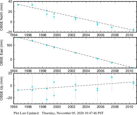 These results are preliminary. The station positions are unchecked and should not be used for any engineering applications. There may be errors in the antenna heights. The velocities are very dependent on the length of the span of observations. The presence of outliers (errant observations) sometimes contaminates the velocities.