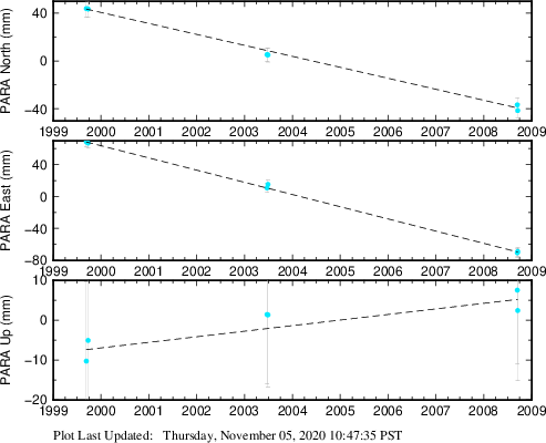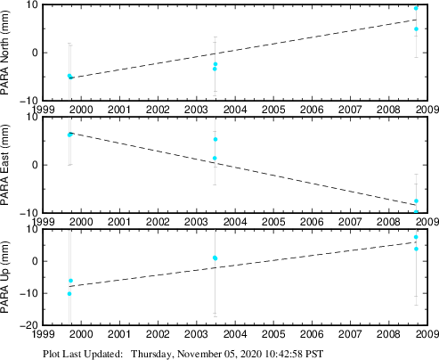These results are preliminary. The station positions are unchecked and should not be used for any engineering applications. There may be errors in the antenna heights. The velocities are very dependent on the length of the span of observations. The presence of outliers (errant observations) sometimes contaminates the velocities.