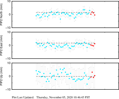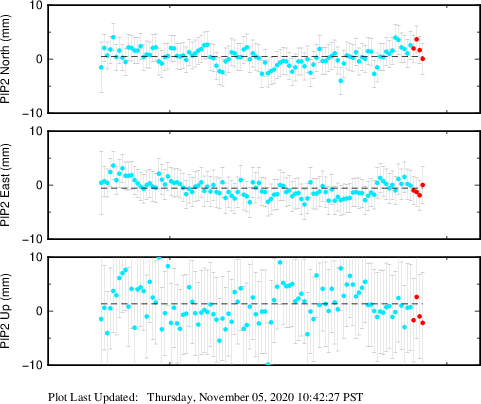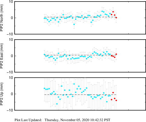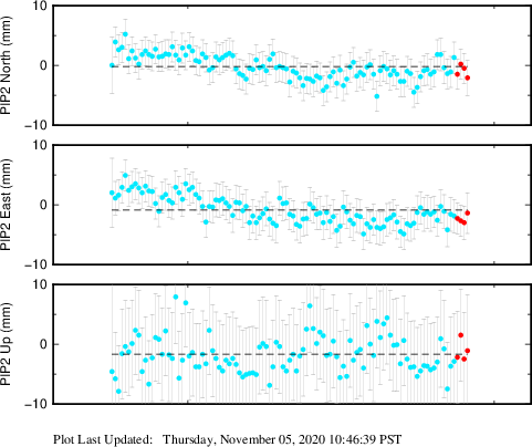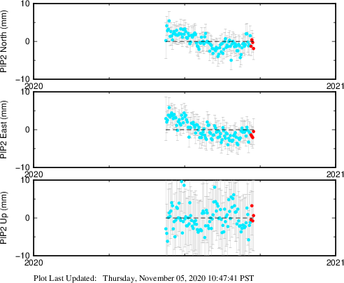 These results are preliminary. The station positions are unchecked and should not be used for any engineering applications. There may be errors in the antenna heights. The velocities are very dependent on the length of the span of observations. The presence of outliers (errant observations) sometimes contaminates the velocities.