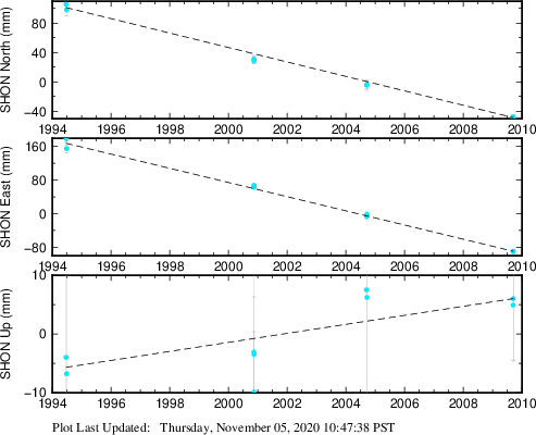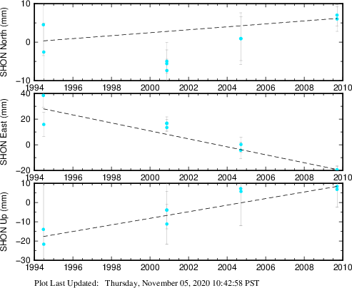 These results are preliminary. The station positions are unchecked and should not be used for any engineering applications. There may be errors in the antenna heights. The velocities are very dependent on the length of the span of observations. The presence of outliers (errant observations) sometimes contaminates the velocities.
