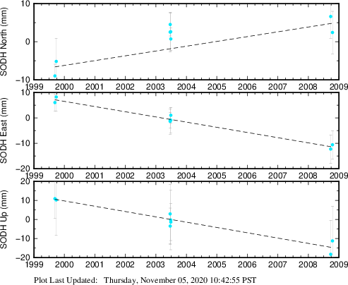 These results are preliminary. The station positions are unchecked and should not be used for any engineering applications. There may be errors in the antenna heights. The velocities are very dependent on the length of the span of observations. The presence of outliers (errant observations) sometimes contaminates the velocities.