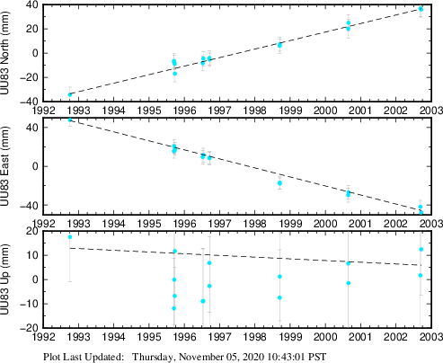 These results are preliminary. The station positions are unchecked and should not be used for any engineering applications. There may be errors in the antenna heights. The velocities are very dependent on the length of the span of observations. The presence of outliers (errant observations) sometimes contaminates the velocities.