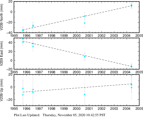 These results are preliminary. The station positions are unchecked and should not be used for any engineering applications. There may be errors in the antenna heights. The velocities are very dependent on the length of the span of observations. The presence of outliers (errant observations) sometimes contaminates the velocities.