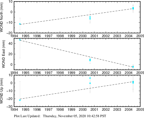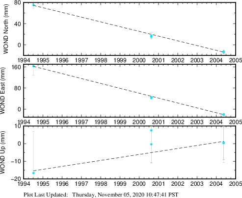 These results are preliminary. The station positions are unchecked and should not be used for any engineering applications. There may be errors in the antenna heights. The velocities are very dependent on the length of the span of observations. The presence of outliers (errant observations) sometimes contaminates the velocities.