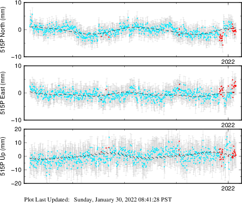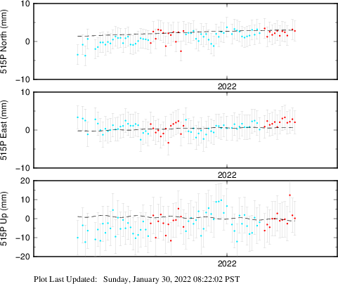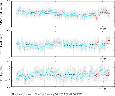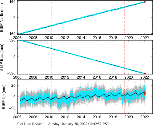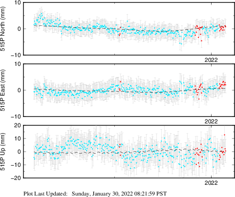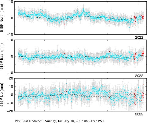 These results are preliminary. The station positions are unchecked and should not be used for any engineering applications. There may be errors in the antenna heights. The velocities are very dependent on the length of the span of observations. The presence of outliers (errant observations) sometimes contaminates the velocities.