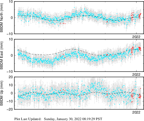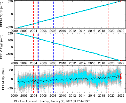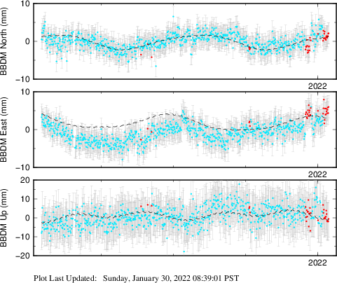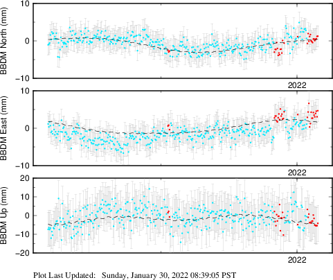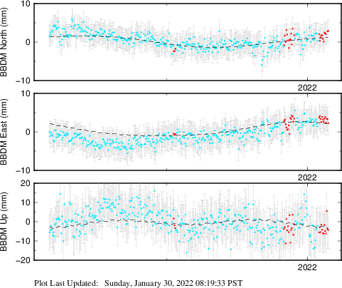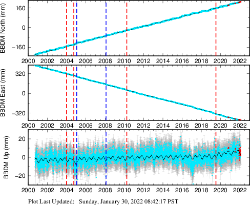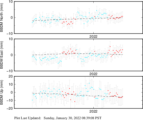 These results are preliminary. The station positions are unchecked and should not be used for any engineering applications. There may be errors in the antenna heights. The velocities are very dependent on the length of the span of observations. The presence of outliers (errant observations) sometimes contaminates the velocities.