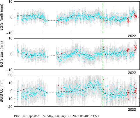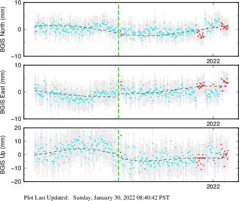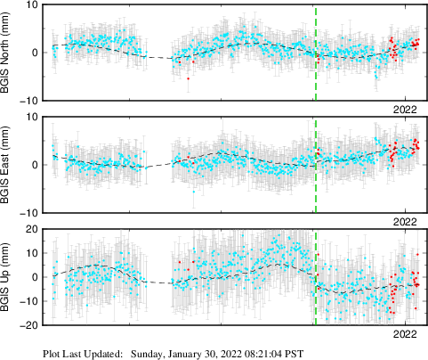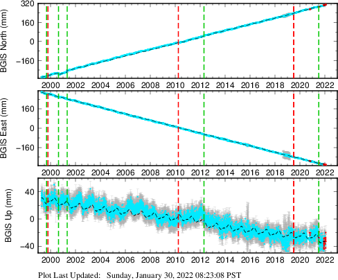 These results are preliminary. The station positions are unchecked and should not be used for any engineering applications. There may be errors in the antenna heights. The velocities are very dependent on the length of the span of observations. The presence of outliers (errant observations) sometimes contaminates the velocities.