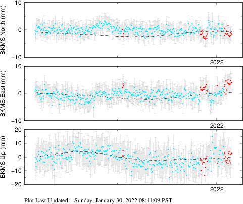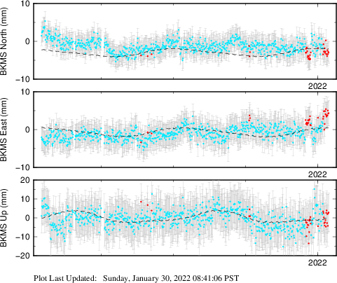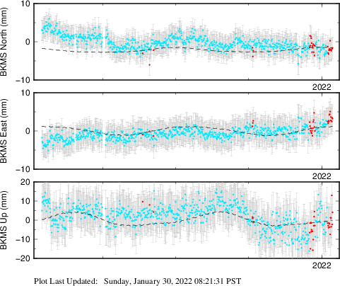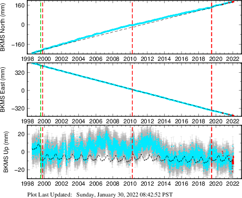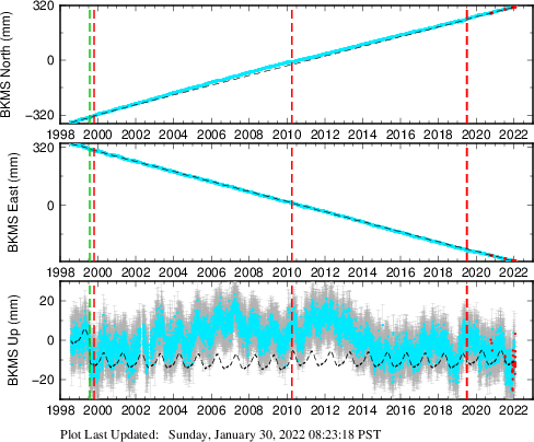 These results are preliminary. The station positions are unchecked and should not be used for any engineering applications. There may be errors in the antenna heights. The velocities are very dependent on the length of the span of observations. The presence of outliers (errant observations) sometimes contaminates the velocities.