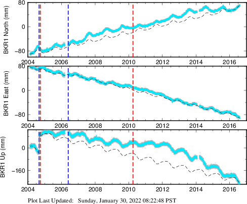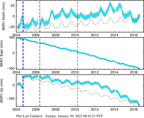 These results are preliminary. The station positions are unchecked and should not be used for any engineering applications. There may be errors in the antenna heights. The velocities are very dependent on the length of the span of observations. The presence of outliers (errant observations) sometimes contaminates the velocities.