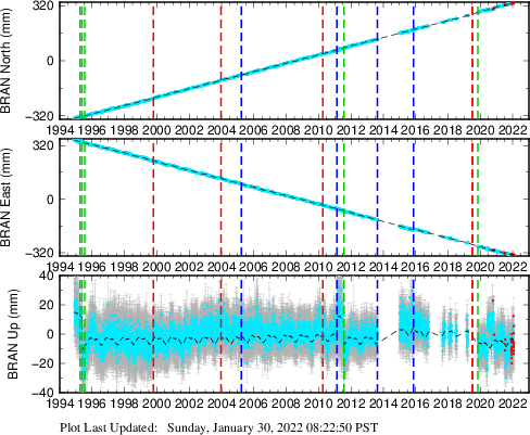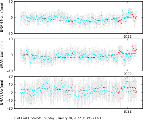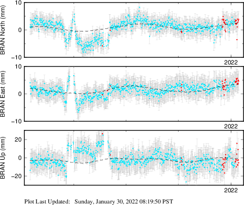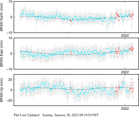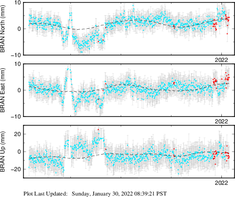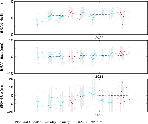 These results are preliminary. The station positions are unchecked and should not be used for any engineering applications. There may be errors in the antenna heights. The velocities are very dependent on the length of the span of observations. The presence of outliers (errant observations) sometimes contaminates the velocities.