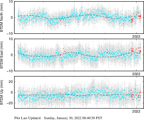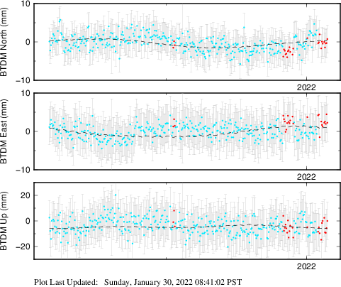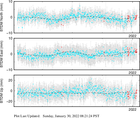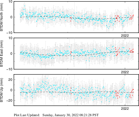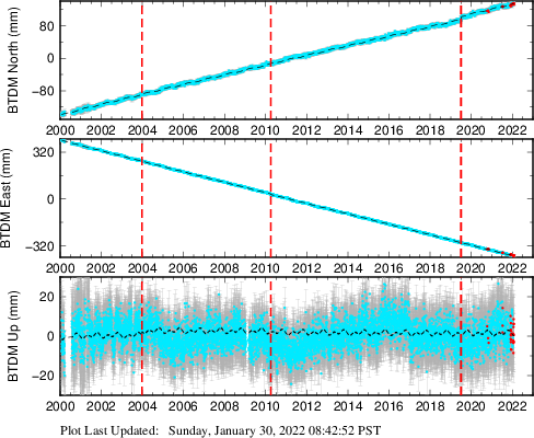 These results are preliminary. The station positions are unchecked and should not be used for any engineering applications. There may be errors in the antenna heights. The velocities are very dependent on the length of the span of observations. The presence of outliers (errant observations) sometimes contaminates the velocities.