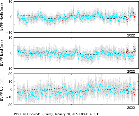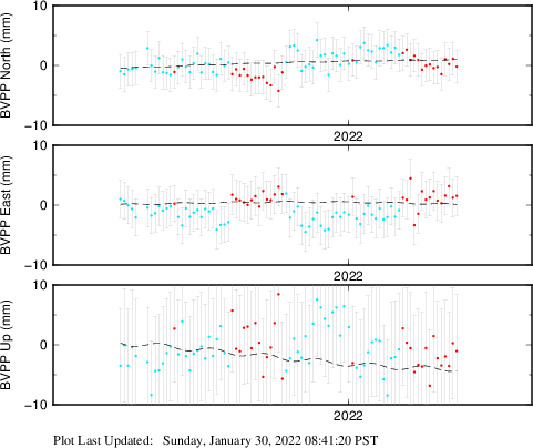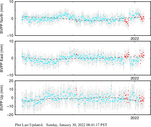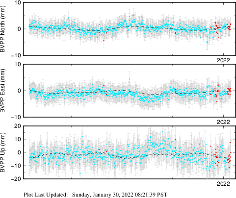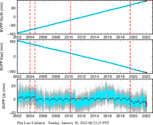 These results are preliminary. The station positions are unchecked and should not be used for any engineering applications. There may be errors in the antenna heights. The velocities are very dependent on the length of the span of observations. The presence of outliers (errant observations) sometimes contaminates the velocities.