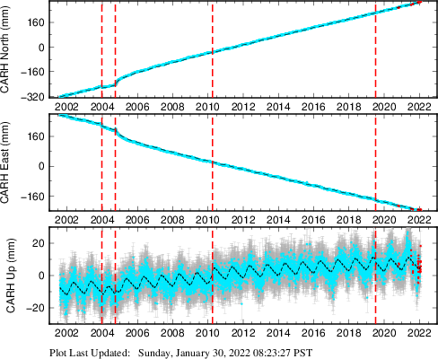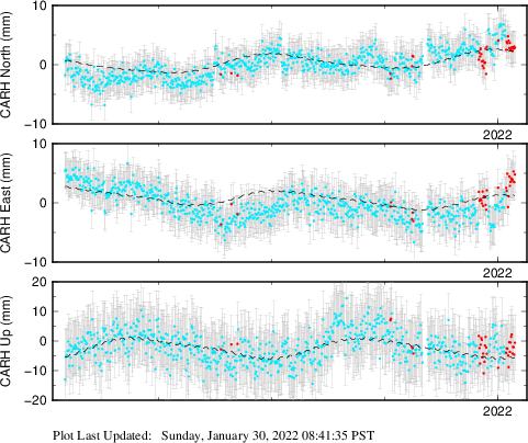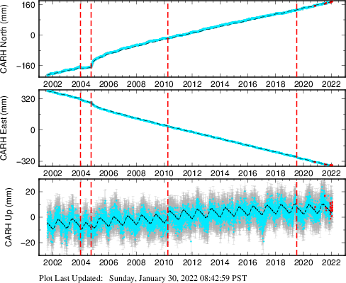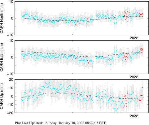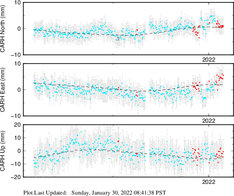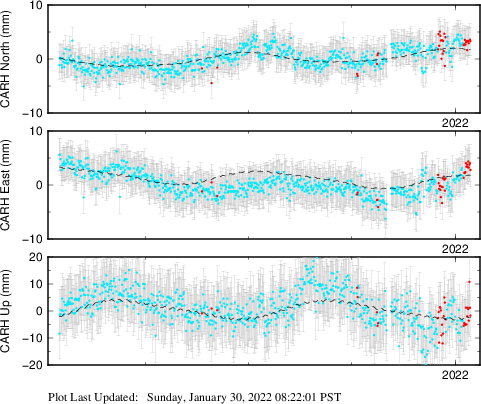 These results are preliminary. The station positions are unchecked and should not be used for any engineering applications. There may be errors in the antenna heights. The velocities are very dependent on the length of the span of observations. The presence of outliers (errant observations) sometimes contaminates the velocities.