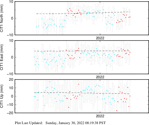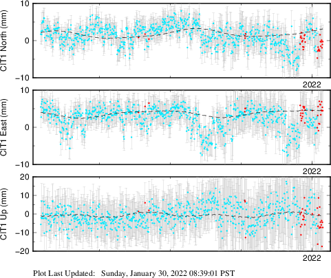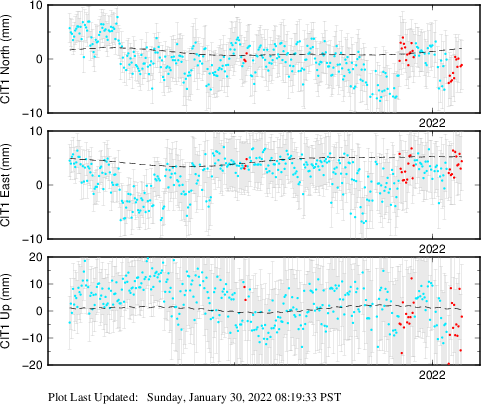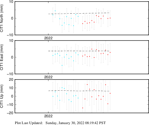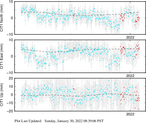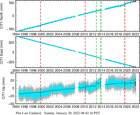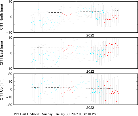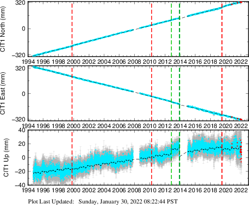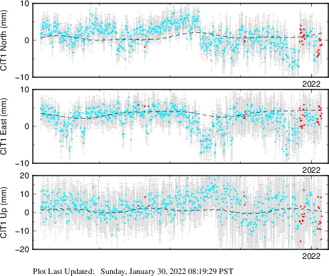 These results are preliminary. The station positions are unchecked and should not be used for any engineering applications. There may be errors in the antenna heights. The velocities are very dependent on the length of the span of observations. The presence of outliers (errant observations) sometimes contaminates the velocities.