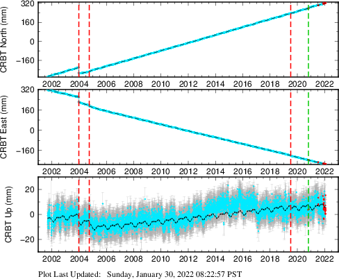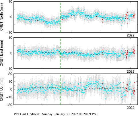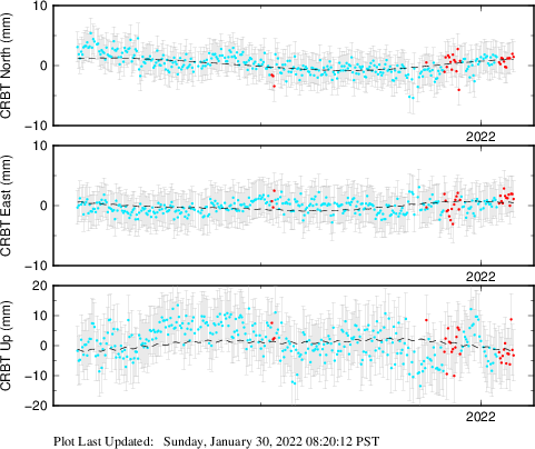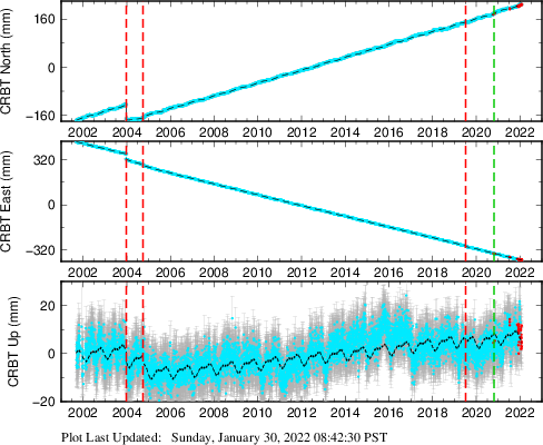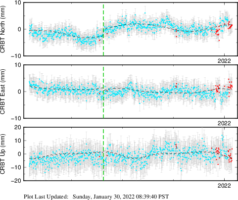 These results are preliminary. The station positions are unchecked and should not be used for any engineering applications. There may be errors in the antenna heights. The velocities are very dependent on the length of the span of observations. The presence of outliers (errant observations) sometimes contaminates the velocities.