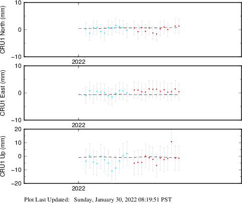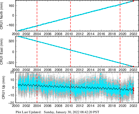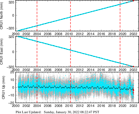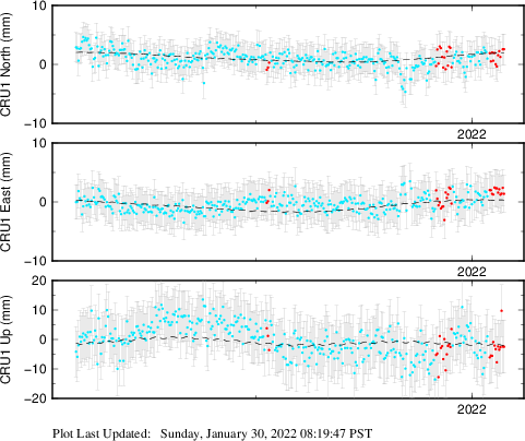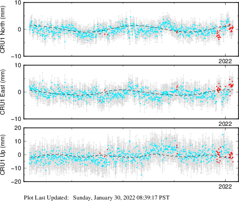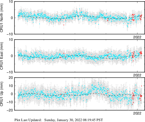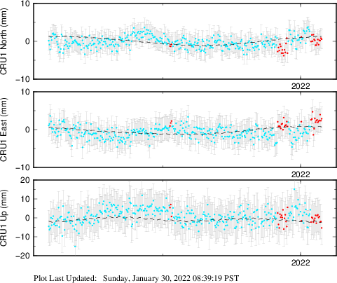 These results are preliminary. The station positions are unchecked and should not be used for any engineering applications. There may be errors in the antenna heights. The velocities are very dependent on the length of the span of observations. The presence of outliers (errant observations) sometimes contaminates the velocities.