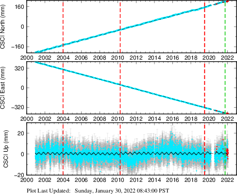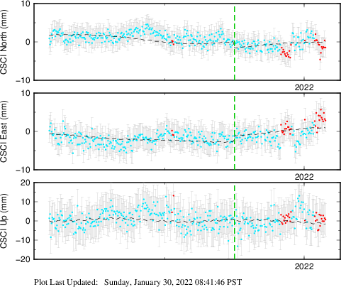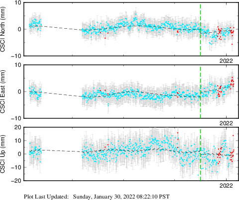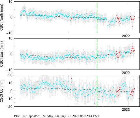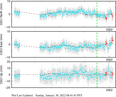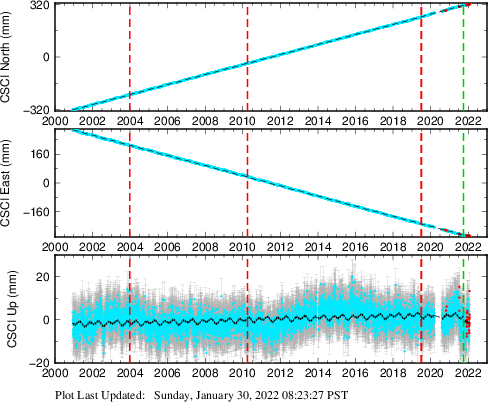 These results are preliminary. The station positions are unchecked and should not be used for any engineering applications. There may be errors in the antenna heights. The velocities are very dependent on the length of the span of observations. The presence of outliers (errant observations) sometimes contaminates the velocities.