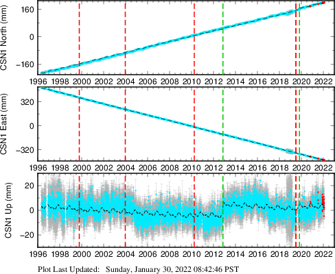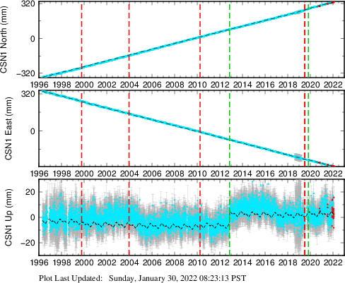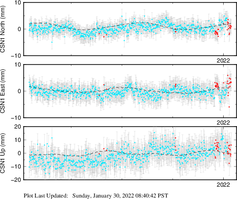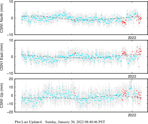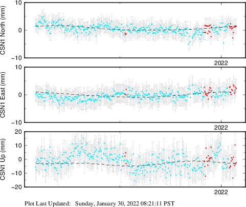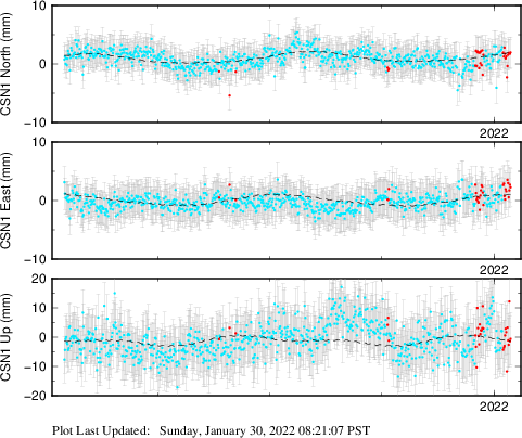 These results are preliminary. The station positions are unchecked and should not be used for any engineering applications. There may be errors in the antenna heights. The velocities are very dependent on the length of the span of observations. The presence of outliers (errant observations) sometimes contaminates the velocities.