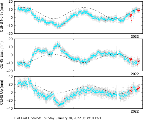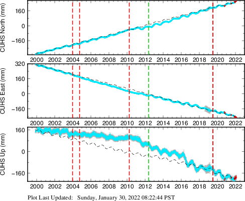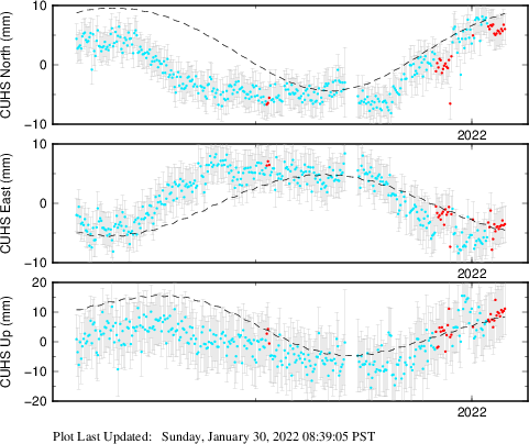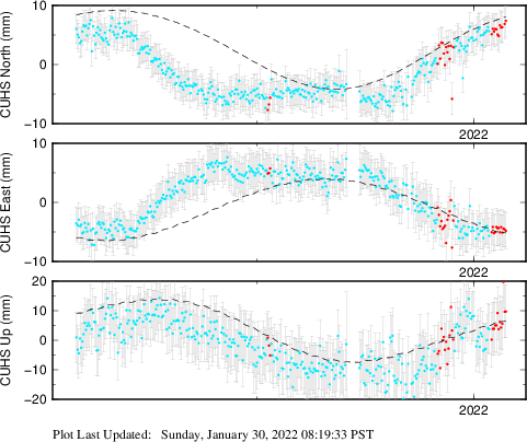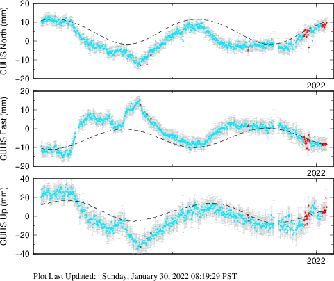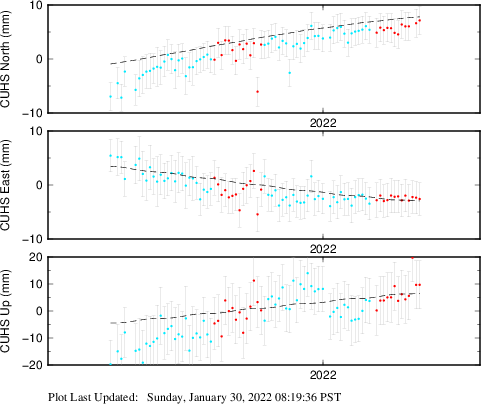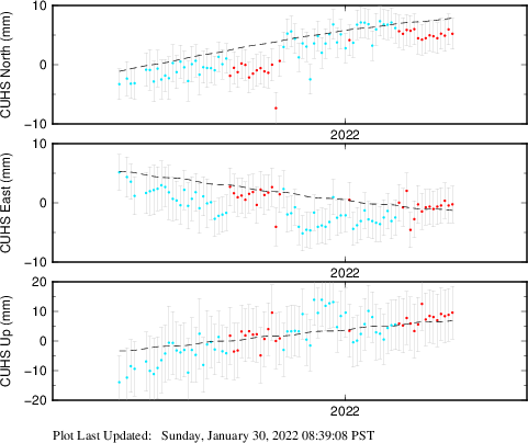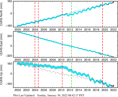 These results are preliminary. The station positions are unchecked and should not be used for any engineering applications. There may be errors in the antenna heights. The velocities are very dependent on the length of the span of observations. The presence of outliers (errant observations) sometimes contaminates the velocities.