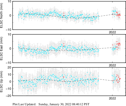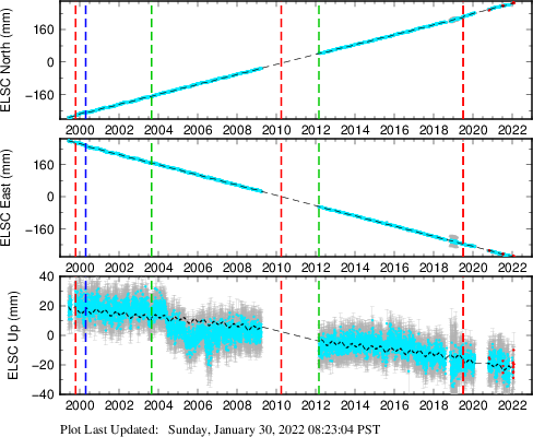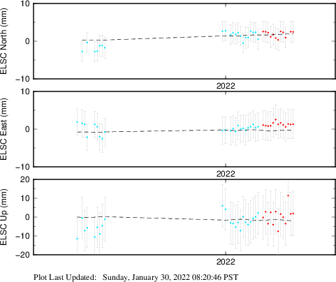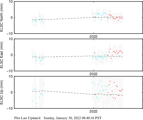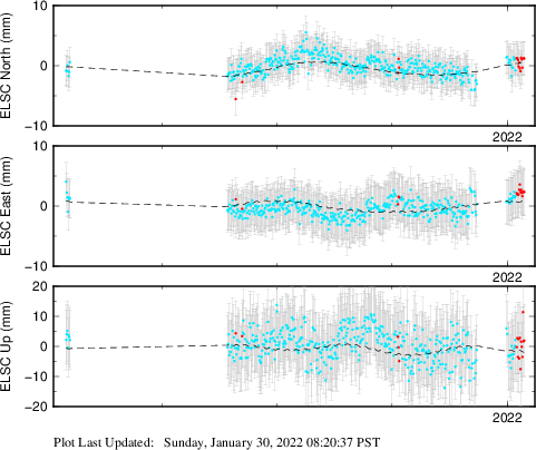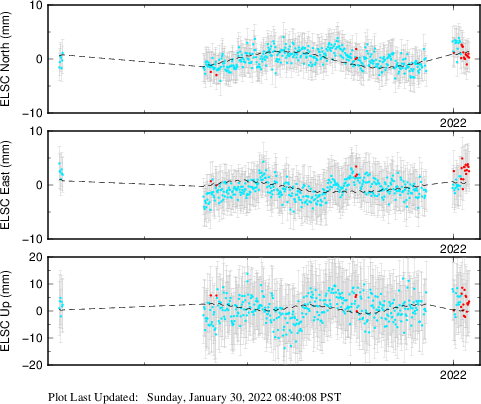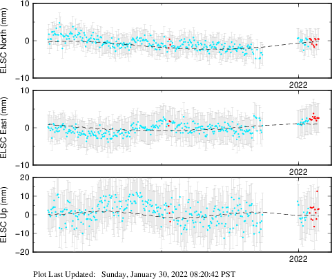 These results are preliminary. The station positions are unchecked and should not be used for any engineering applications. There may be errors in the antenna heights. The velocities are very dependent on the length of the span of observations. The presence of outliers (errant observations) sometimes contaminates the velocities.