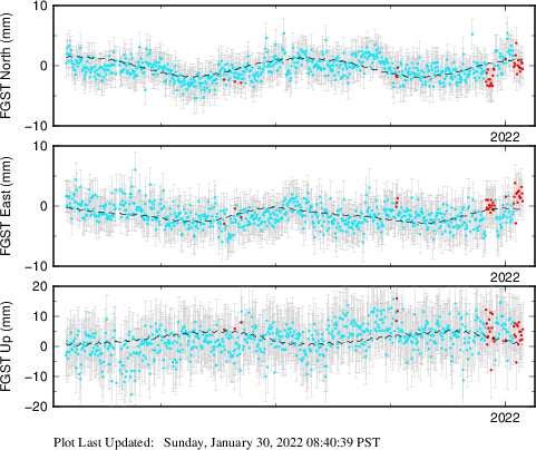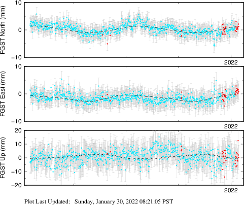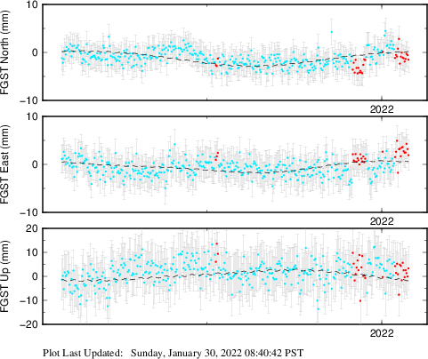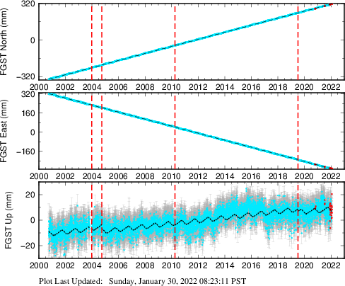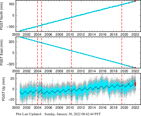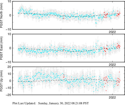 These results are preliminary. The station positions are unchecked and should not be used for any engineering applications. There may be errors in the antenna heights. The velocities are very dependent on the length of the span of observations. The presence of outliers (errant observations) sometimes contaminates the velocities.