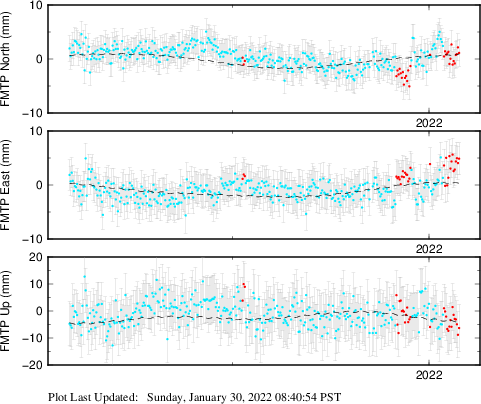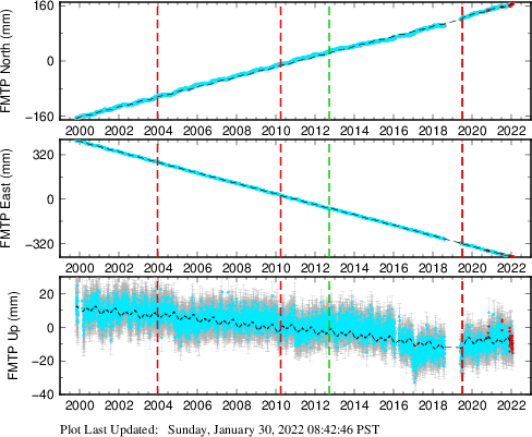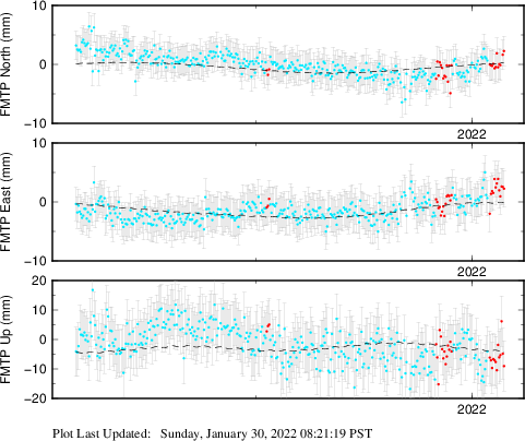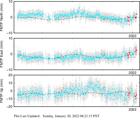 These results are preliminary. The station positions are unchecked and should not be used for any engineering applications. There may be errors in the antenna heights. The velocities are very dependent on the length of the span of observations. The presence of outliers (errant observations) sometimes contaminates the velocities.